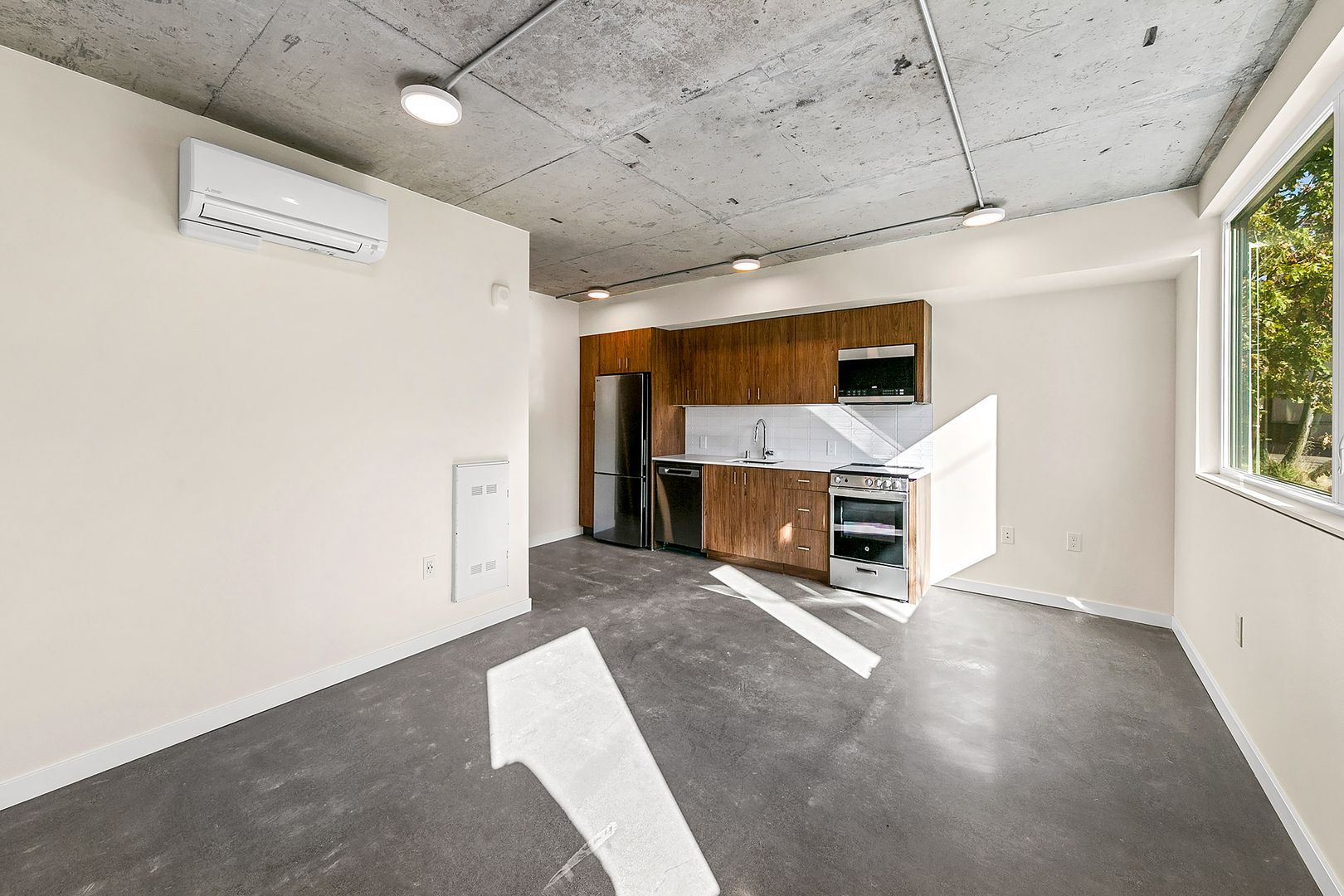 Oversized windows make this efficient, light filled studio feel bigger than its 430 SF size. You’ll enjoy every inch of the space due to the home’s extensive cabinetry and built in wardrobe. Constructed of rich walnut harkening to 60's design, the signature Fremont View wardrobe includes both hanging space and drawers. Goodbye dresser! A stacked, front loading washer and dryer support multitasking while working from home at a light filled desk nook overlooking the neighborhood’s leafy trees. South facing windows ensure a warm sunny glow throughout the year, and a combination of roller shades and integrated air conditioning will support a chill environment even on the warmest days.