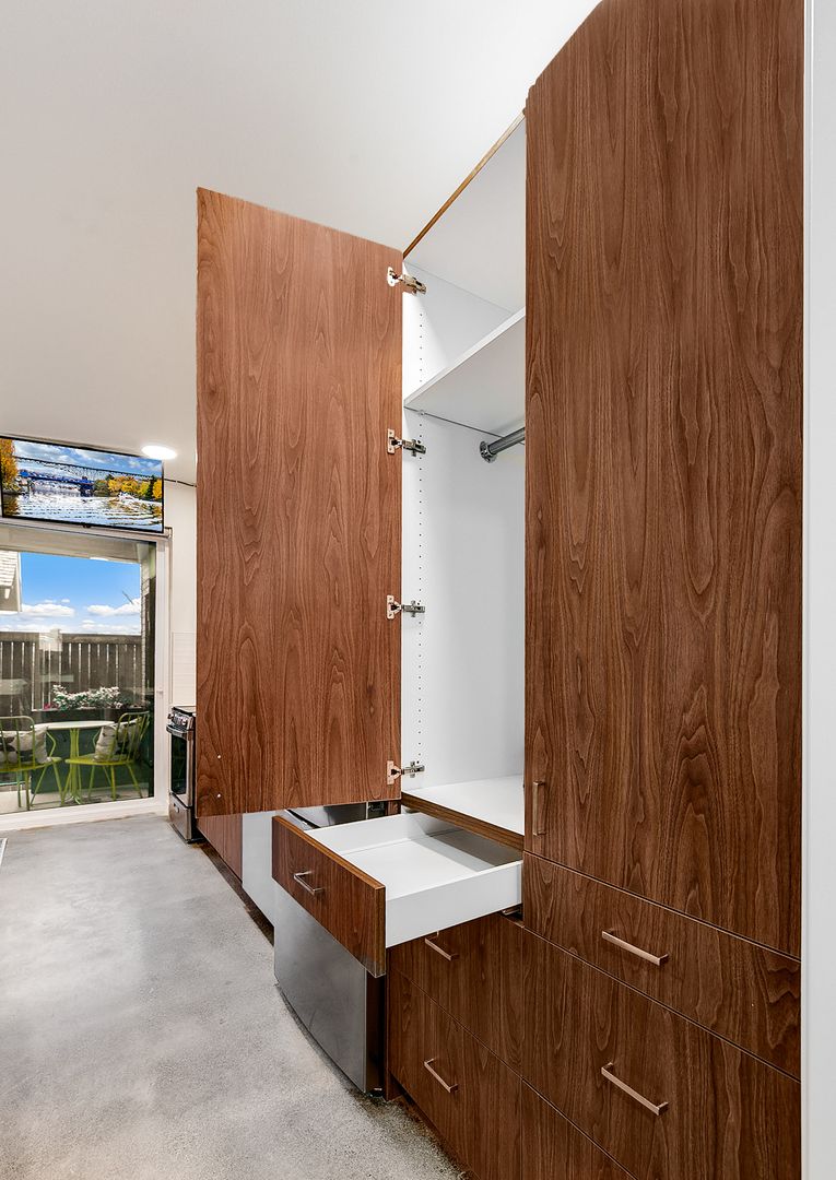 Expansive wall-to-wall walnut cabinetry, including a built-in wardrobe
